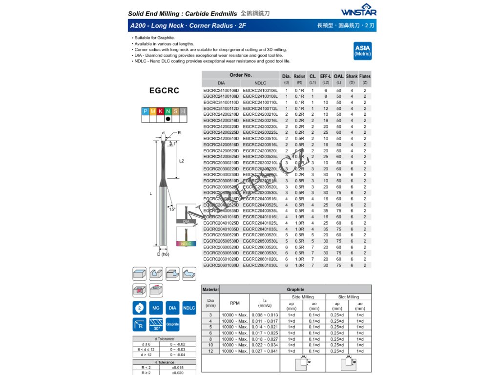 - Karbidové monolitní toroidní frézy A200 značky WINSTAR jsou vhodné pro obrábění grafitu