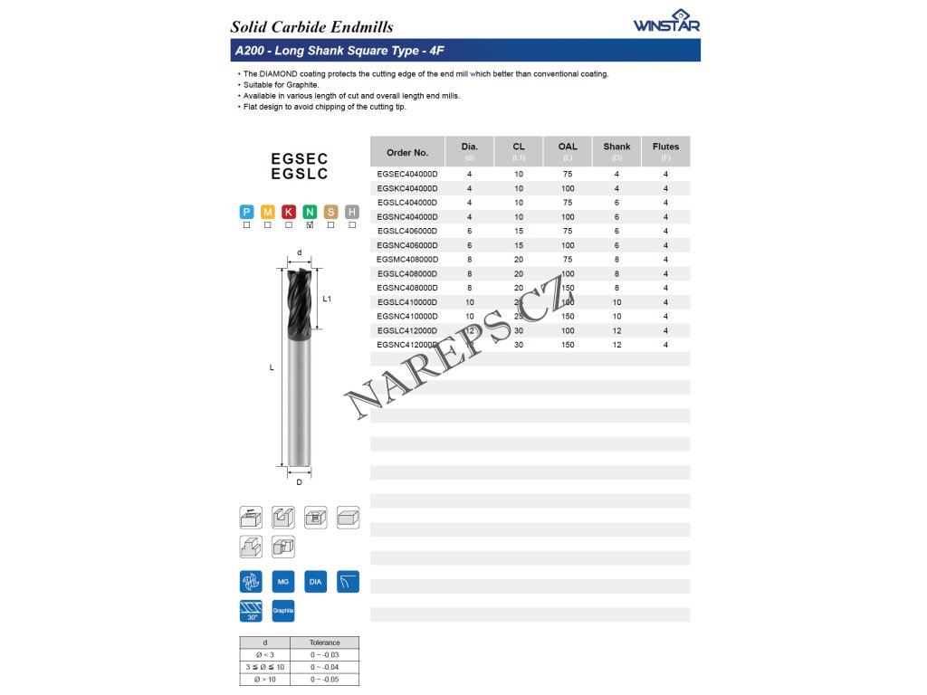 - Karbidové monolitní frézy A200 značky WINSTAR jsou vhodné pro obrábění grafitu