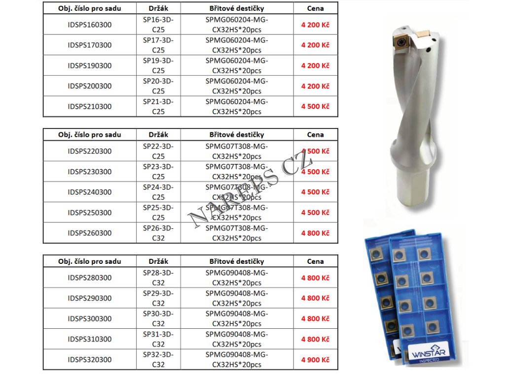 Plátkový vrták DSP jako zvýhodněný SET: těleso+20destiček za uvedenou cenu. Břitovédestičky se 4hranami, vhodné do oceli, nerezi a litiny