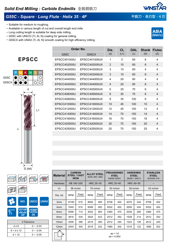 Tvrdokovová 4zubá monolitní fréza prodloužená, značky WINSTAR je díky povlaku UNICO vhodná pro ocel, nerez, litinu i kalený materiál do 55HRC. Díky pevné geometrii a úhlu břitu 30° má vynikající řezné vlastnosti a velmi přesné obrábění pro boční frézování. Umožňuje frézování drážek, polodrážek, trochodiní frézování, zavrtávání, ramping i přerušovaný řez.