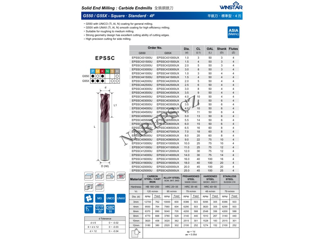 Tvrdokovová 4zubá monolitní fréza značky WINSTAR je díky povlaku UNICO vhodná pro ocel, nerez, litinu i kalený materiál do 55HRC. Díky pevné geometrii a úhlu břitu 30° má vynikající řezné vlastnosti a velmi přesné obrábění pro boční frézování. Umožňuje frézování drážek, polodrážek, trochodiní frézování, zavrtávání, ramping i přerušovaný řez.