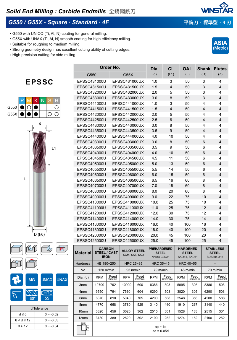 Tvrdokovová 4zubá monolitní fréza značky WINSTAR je díky povlaku UNICO vhodná pro ocel, nerez, litinu i kalený materiál do 55HRC. Díky pevné geometrii a úhlu břitu 30° má vynikající řezné vlastnosti a velmi přesné obrábění pro boční frézování. Umožňuje frézování drážek, polodrážek, trochodiní frézování, zavrtávání, ramping i přerušovaný řez.