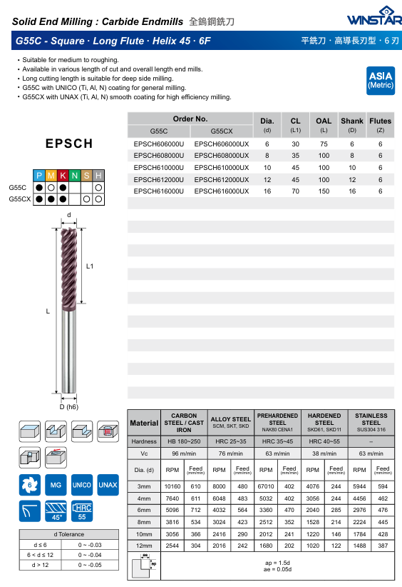Tvrdokovová 6zubá monolitní dokončovací fréza značky WINSTAR je díky povlaku UNICO vhodná pro ocel, nerez, litinu i kalený materiál do 55HRC. Díky pevné geometrii a úhlu břitu 45° má vynikající řezné vlastnosti a velmi přesné obrábění pro vysokorychlostní frézování. Umožňuje frézování drážek, polodrážek, trochodiní frézování, zavrtávání, ramping i přerušovaný řez. Vhodná je především pro dokončování.